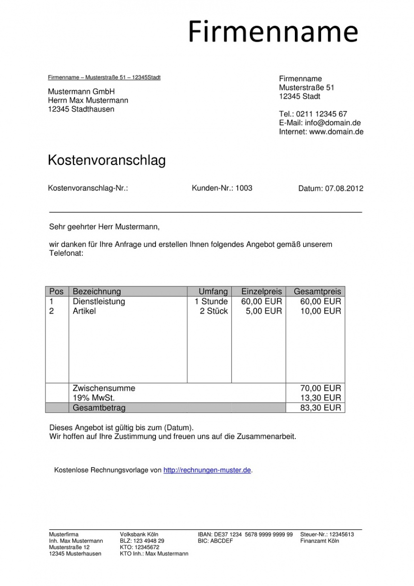 Kostenvoranschlag Muster Kostenlos Downloaden